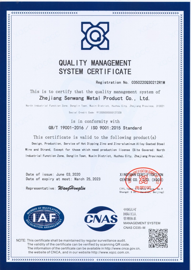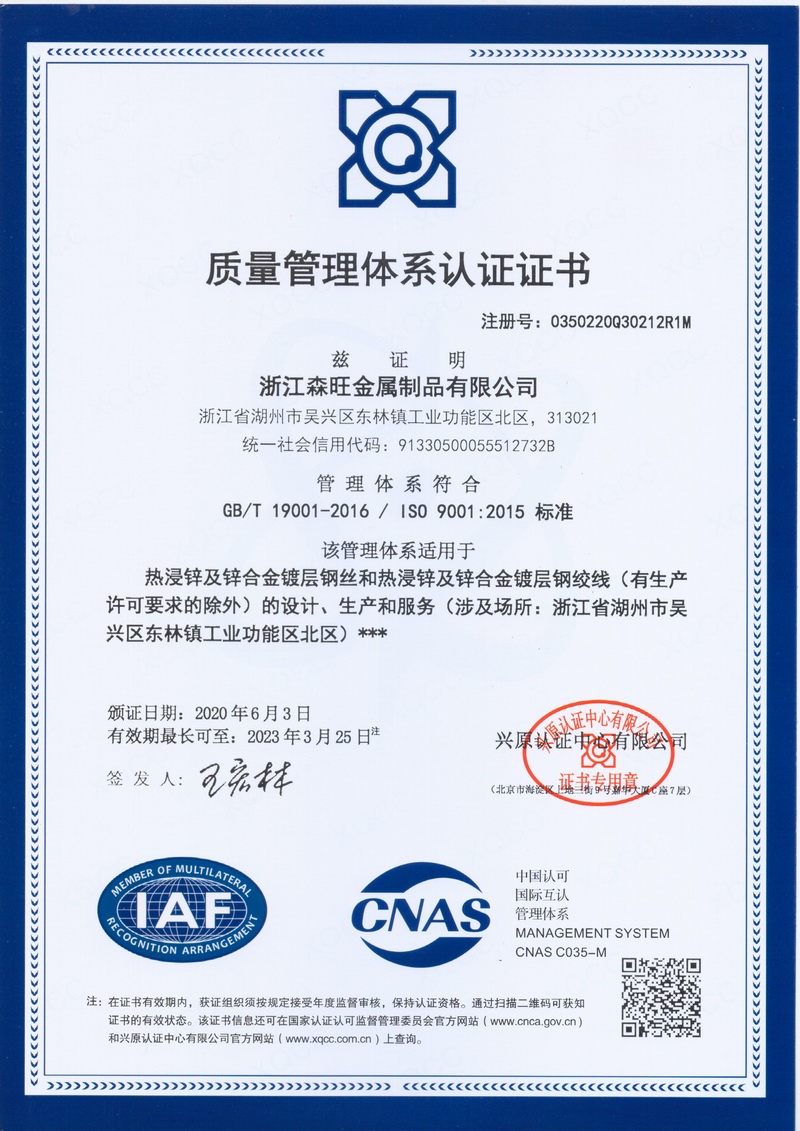 浙江森旺金屬制品有限公司成立于2012年,坐落湖州市吳興區(qū)東林鎮(zhèn)工業(yè)功能區(qū)。公司專業(yè)從事各類鍍鋅鋼絲、鋼絞線等產(chǎn)品的開發(fā)及生產(chǎn)。目前產(chǎn)品已廣泛應用于各類通信光電纜,電力輸送,電氣化鐵路工程,各類堤壩防護及農(nóng)業(yè)溫室等工程領域。公司秉承“追求卓越品質(zhì),創(chuàng)建卓著信譽”的經(jīng)營理念,始終堅持專業(yè)化、規(guī)模化的經(jīng)營模式。